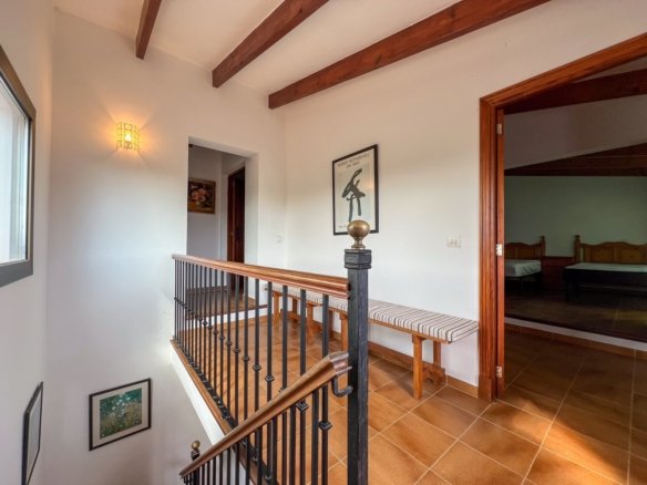 On the first floor, the bedrooms open onto terraces with views stretching across the pool and toward the sea. This detail makes the finca more than just a country home—it feels like a sea view home rental Mallorca, where mornings start with natural light and Mediterranean panoramas.